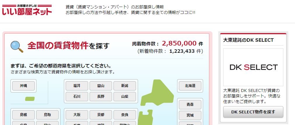 いい部屋ネットは、不動産仲介業者の中では、掲載物件数が多く、一部仲介手数料がゼロ円か家賃の1ヶ月分の半分で入れる物件があります。