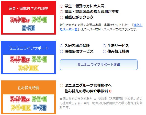 ミニミニは「スーパー君」というシステムがあり、入居時の費用が安く上がるプランが用意されています。