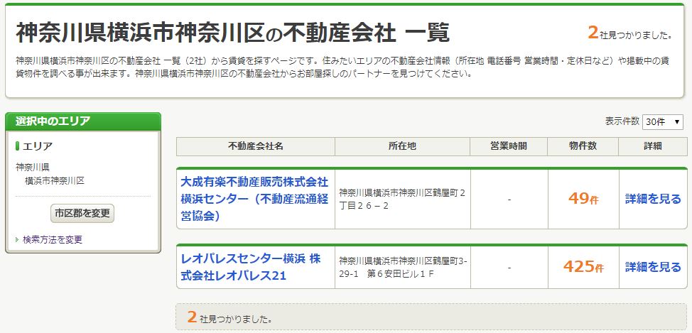 神奈川県横浜市神奈川区で探すと2件の不動産屋がヒットしました。