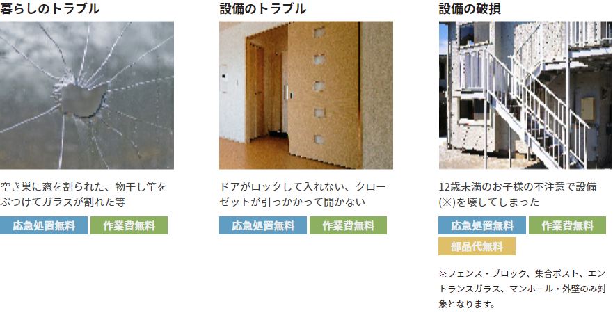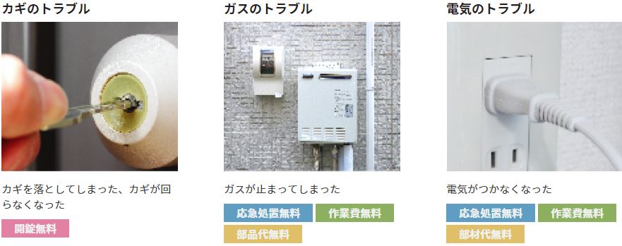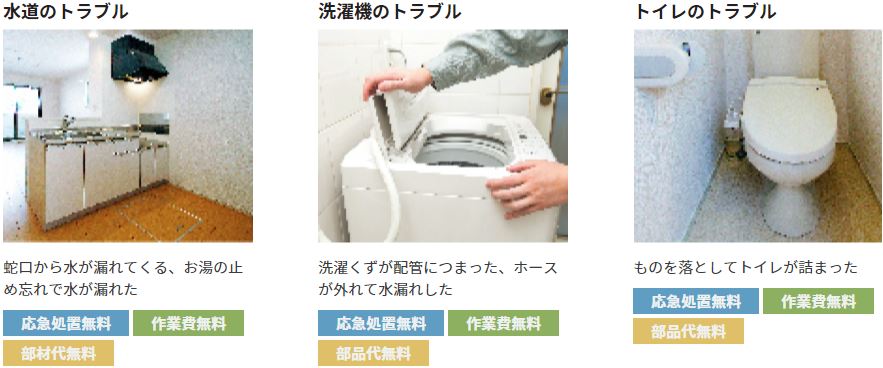 お部屋で起きるさまざまなトラブルに、すぐに対応してくれ、緊急出勤費、応急処置、部材代、作業費などが無料になる。
