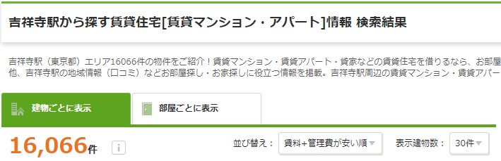例えば、東京で人気の街「吉祥寺」駅の物件をなんの条件も入れないで抽出すると11件。