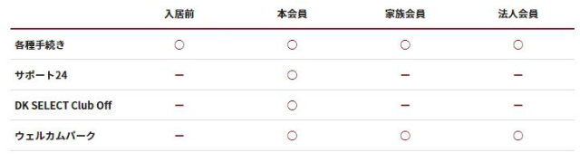 DK SELECT会員サービス(無料)という制度があり、入居後のお部屋でのトラブルに24時間体制で対応、グルメ・レジャー施設の優遇価格、ウェルカムパークという駐車場空き区画の時間貸しサービスなどが利用できる。
