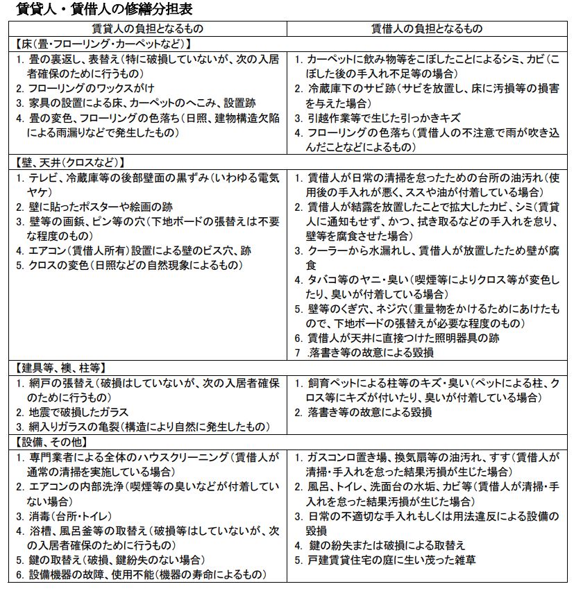 国土交通省が示している、賃貸人と賃借人の修繕負担表は次になります。