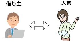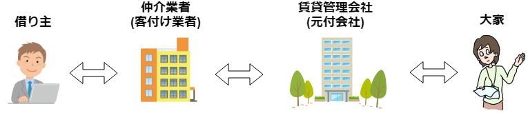 - 「借り主」⇔「仲介業者」⇔「賃貸管理会社」⇔「大家」