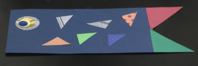 Step2 画用紙を三角形にカット(2枚)し、長方形の画用紙に尾ひれを着ける