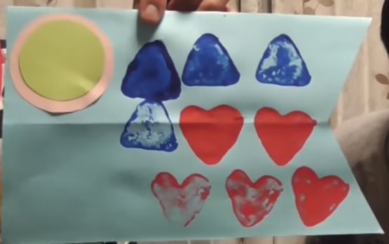 あとは子供にかたどった粘土に絵の具をつけて、色画用紙にスタンプする。