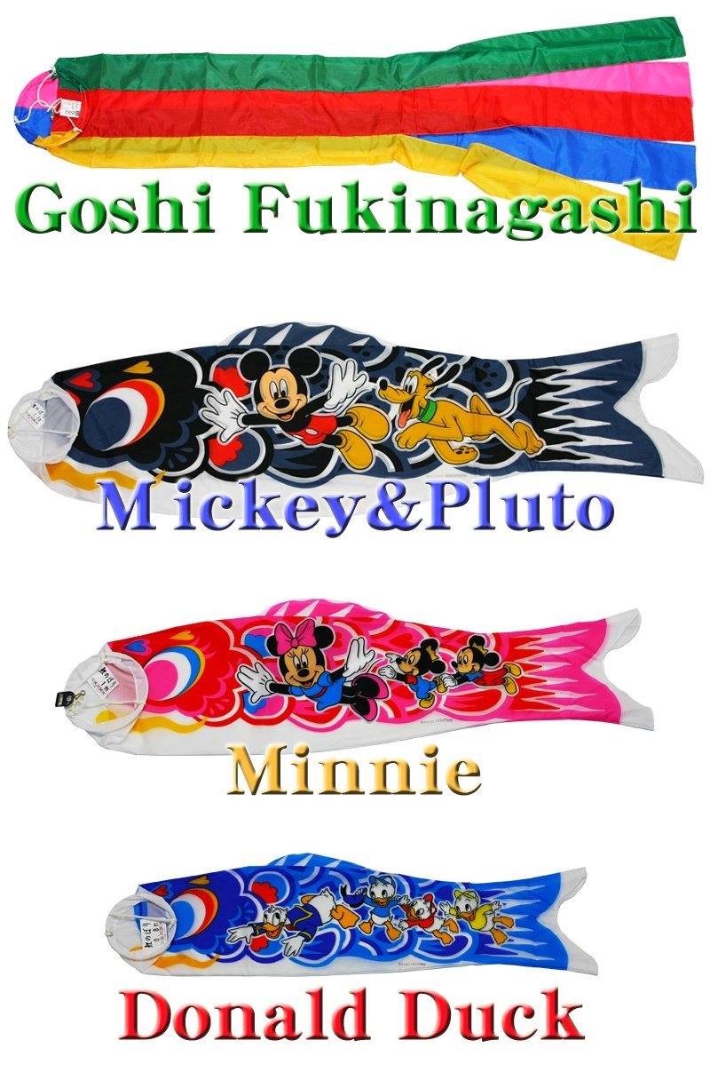 黒鯉には「Mickey、Pluto」、赤鯉には「Minnie」、青鯉には「Donald Duck」が描かれています。