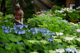 本堂平場論蔵の背後にある斜面に植えられたあじさいはヒメアジサイ、クロヒメ、 ブルースカイ、ウズアジサイ、西洋アジサイ、アナベル、クロジク、ベニガクなどがあり、その品種が非常に豊富で 沢山の彩りを見せてくれます。