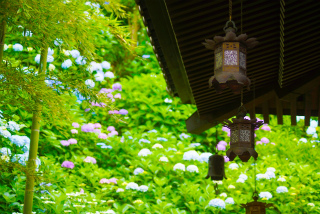 山の斜面を見事に埋め尽くしている2,500株のあじさいは品種が多く、お花の寺としても有名で、その素晴らしい景観は 多くの人に親しまれています。