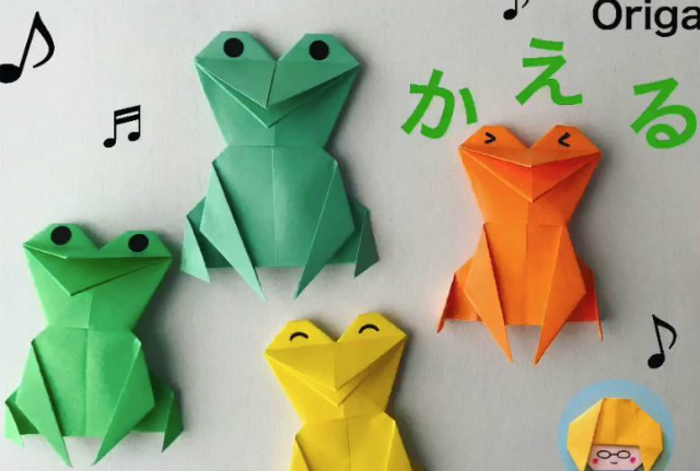 折り紙1枚で作れるカエル。 顔はペンで自分でかくので、好きな表情にできますし、クラフトパンチで切り抜いた丸い折り紙を張り付けてもできます。