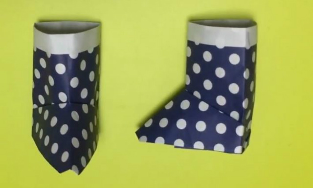 小さな折り紙1枚でカンタンにつくれる立体型レインブーツです。