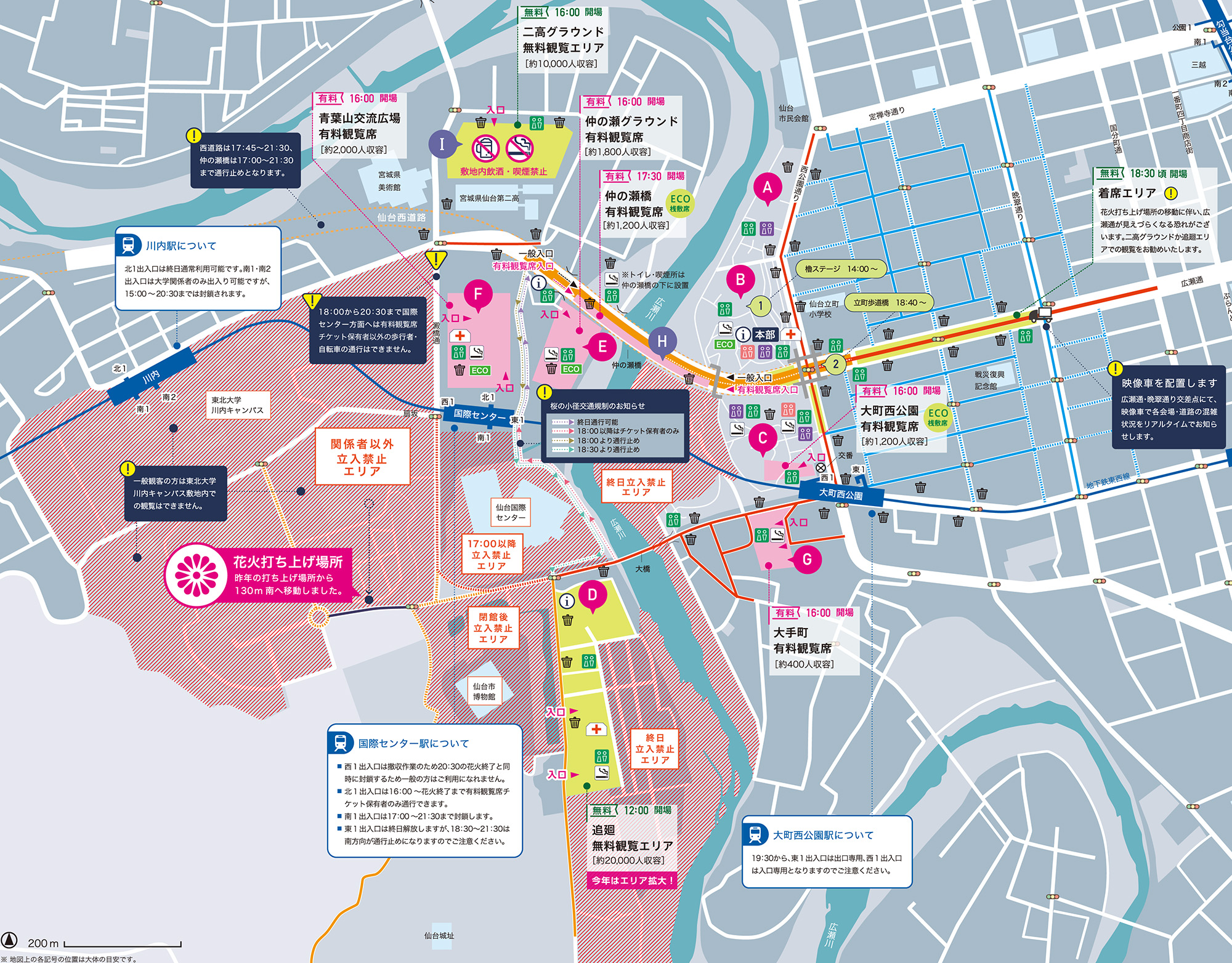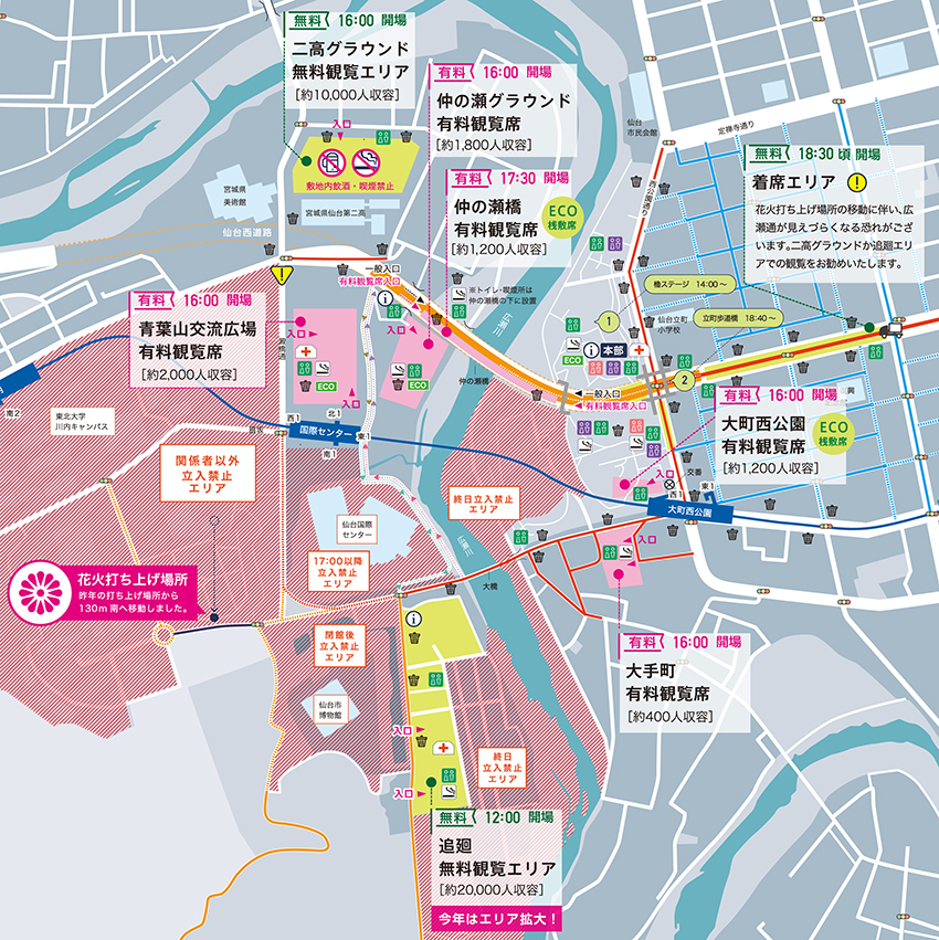 また、2013年までは広瀬川仲ノ瀬緑地運動広場で打ち上げられたいたのですが、2014年から東北大学百周年記念会館(川内萩ホール)敷地内に移動したのでより市街地に入った場所からの打ち上げになります。