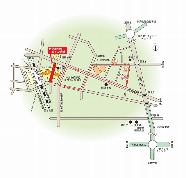 | 車でのアクセス | 名神高速道路「一宮インターチェンジ」 北西へ15分、東海北陸自動車道「一宮木曽川インターチェンジ」 南へ10分、「一宮西インターチェンジ」 北東へ10分 |