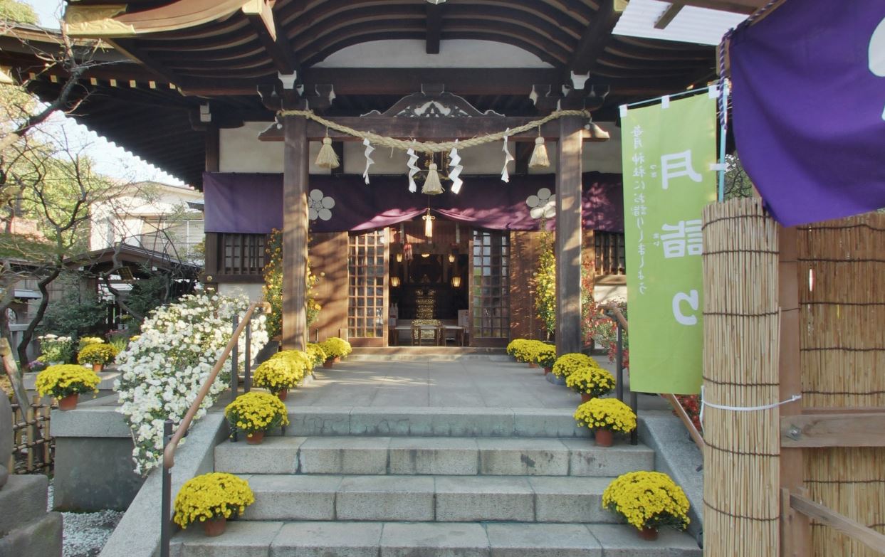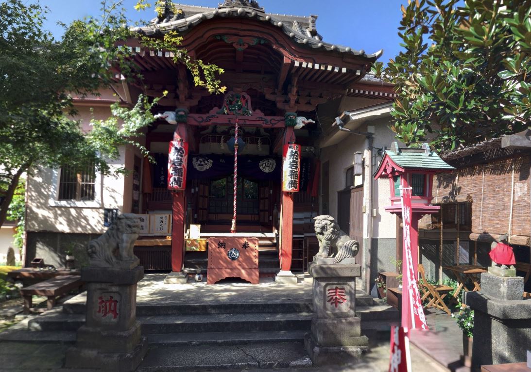 境内には芸能浅間神社、威徳稲荷神社が祀られており、芸道成就、成功祈願、縁結び、夫婦和合、子宝、恋愛にまつわるご利益があるとされ、若い女性たちがの人気スポットである。