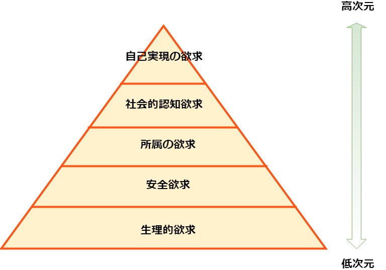 人間の欲求は下の要求から順に発生し、その欲求が満たされると、初めて次の上の要求が生まれるという理論です。