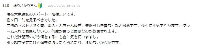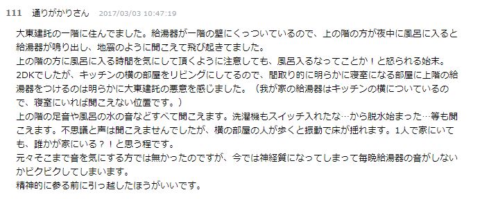 騒音がひどいという話は、大量に書かれていますが、これはいい部屋ネットの物件だけではなく、他にも十分起こり得るので全部を信じる必要なないと思いますが、大東建託の物件に入るなら、覚悟はしておいたほうが良いでしょう。