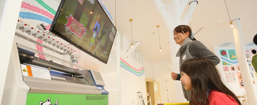 島精機が世界に誇る自動横編み機「ホールガーメント」でオリジナルの編み物を作ることができるアトラクション。自転車やボートをこいだりすることで動力が発生し、「ホールガーメント」が稼働します。自分のイニシャルが入ったリストバンドをゲットできる。