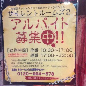 2016年12月10日(土)~2017年12月9日(土)期間限定で開催中のホラーイベント。     このイベントはミッションクリア体験型のホラーアトラクションです。   2016年3月12日から行われた前作「サイレントルームズ」は大好評で、多くの方が来場して、つねに満員状態だった。   体験型で次々と起こるホラー恐怖体験を堪能することができる。 これで絶叫しない人はいないであろう。   前作をより上回る恐怖体験を、恐怖と大幅アップによって演出されている。
