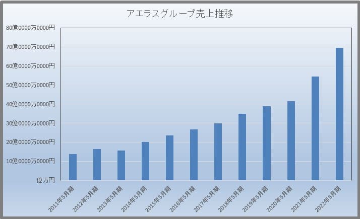 2011年5月期には14億だった売上高は、2022年5月期には69億と5倍にも成長しています。