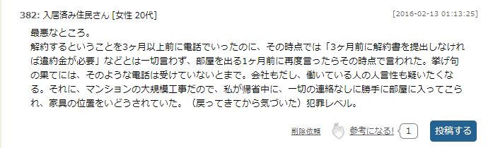 あとは物件の質に関する評判は今ひとつで、「壁が薄く音がうるさい」「建物の作りがちゃちい」「サポートの対応がお粗末」などの評判が多いです。