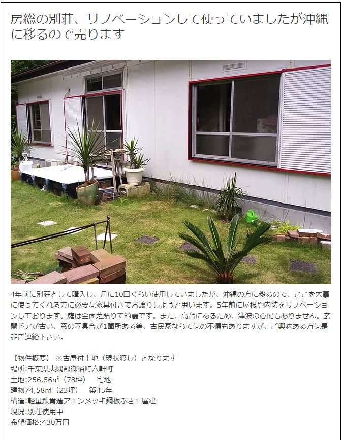 「房総の別荘、リノベーションして使っていましたが沖縄に移るので売ります」などと書かれています。