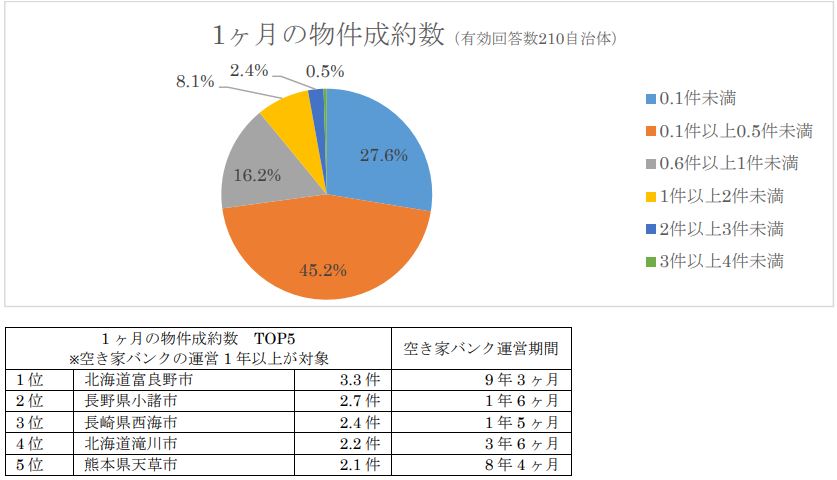 1 ヶ月の物件成約数は 0.1 件以上 0.5 件未満が一番多く全体の 45.2%となっており、全体の89.0%が 1 件未満の物件成約数となっております。また、月間の物件成約数の平均は 0.4 件/月。