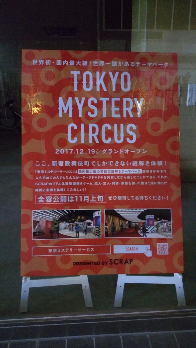 このテーマパクは500坪(1,650㎡)にも及ぶ巨大な面積を使い「リアル脱出ゲーム」など数々の参加型謎解きゲーム・イベントを展開する。 SCRAPが開設する施設で地下1階から地上4階の全5フロアで構成。 フロア毎に異なる謎解き体験ができる。 SCRAPは「東京ミステリーサーカス」を、都市型知的エンターテイメントとして提供する、複合型フラッグシップ施設と位置づけ、今後展開する様々なコンテンツを通じて国内外問わずおどろきと興奮を提供していくとの、思いを語っています。 東京オリンピックを前にして、国外からの顧客も取り込み、その知名度を世界を意識してひろげていこうという、意図を持っているのっだと思います。
